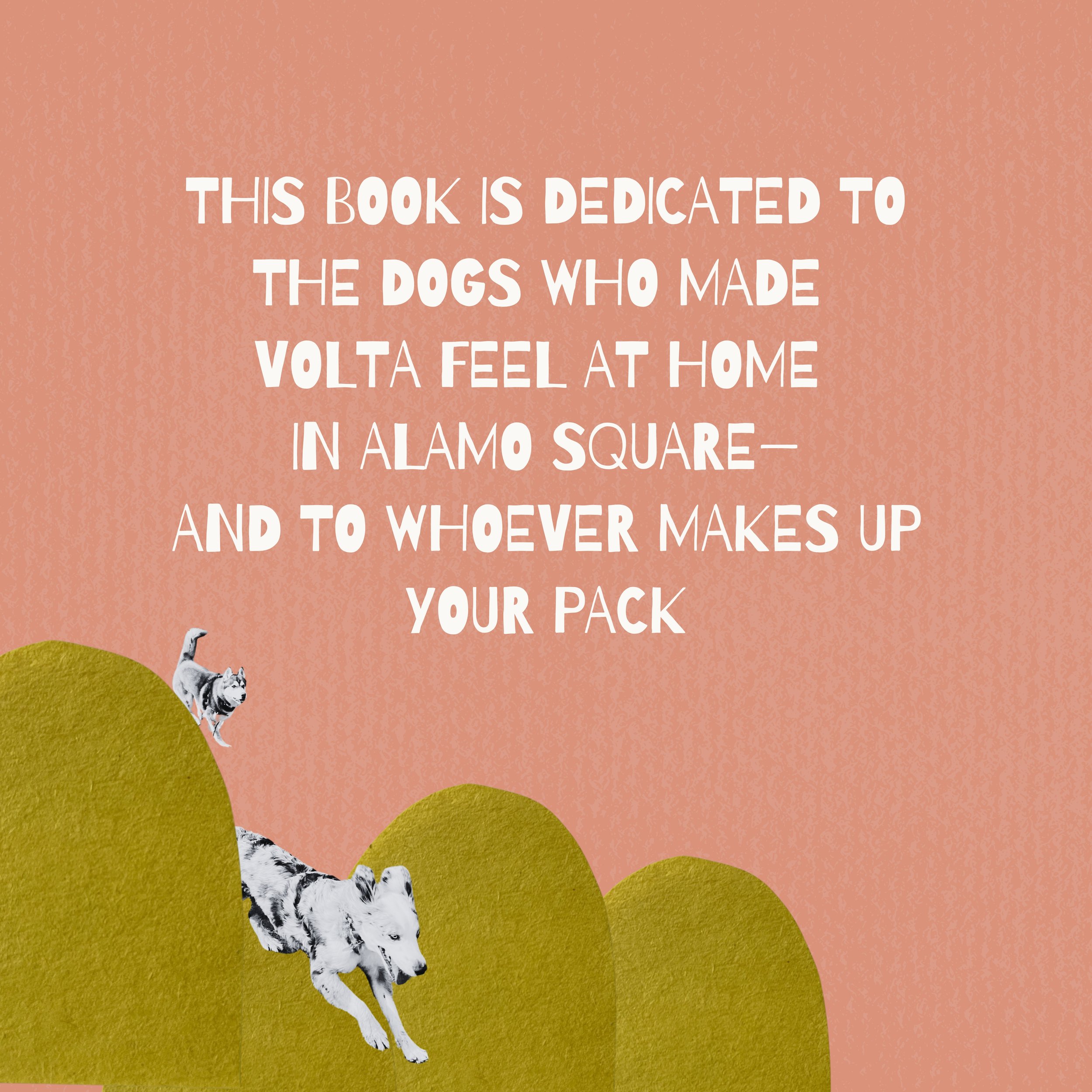 This board book was made while introducing a newly adopted husky puppy, Volta, into the mix at one of San Francisco's most lively dog parks. Meet the dogs of Alamo Square in this sweet book about belonging and the diverse characters—young, old, energetic, food-seeking, and goofy alike—that keep our own parks lively.